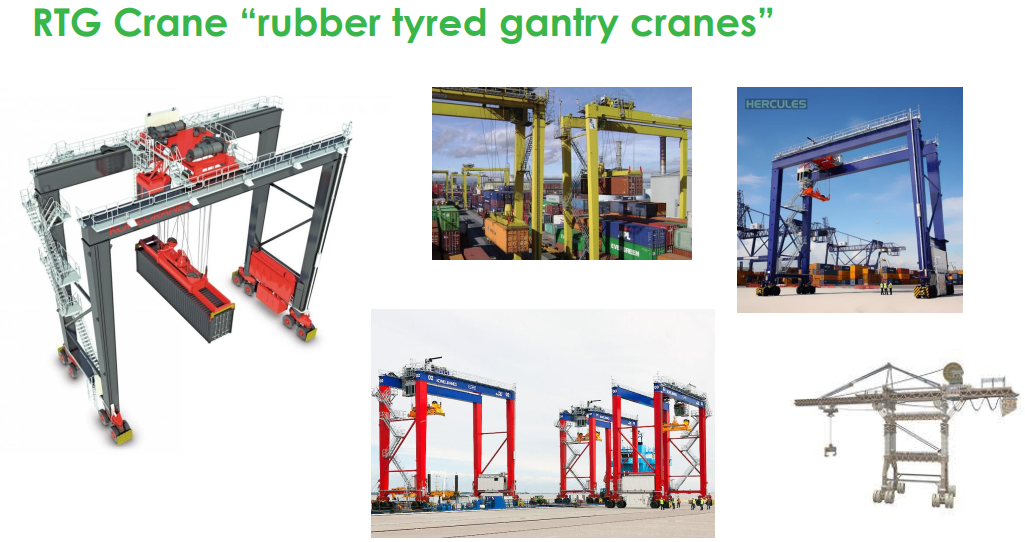Có thể dùng động cơ diesel–điện hybrid hoặc điện từ cáp trượt (E-RTG).