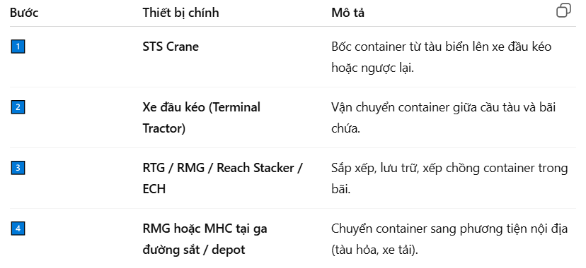 | Straddle Carrier (SC) | Xe nâng có thể “ôm” và di chuyển container qua lại giữa bãi và cầu tàu (dùng ở cảng tự động). |